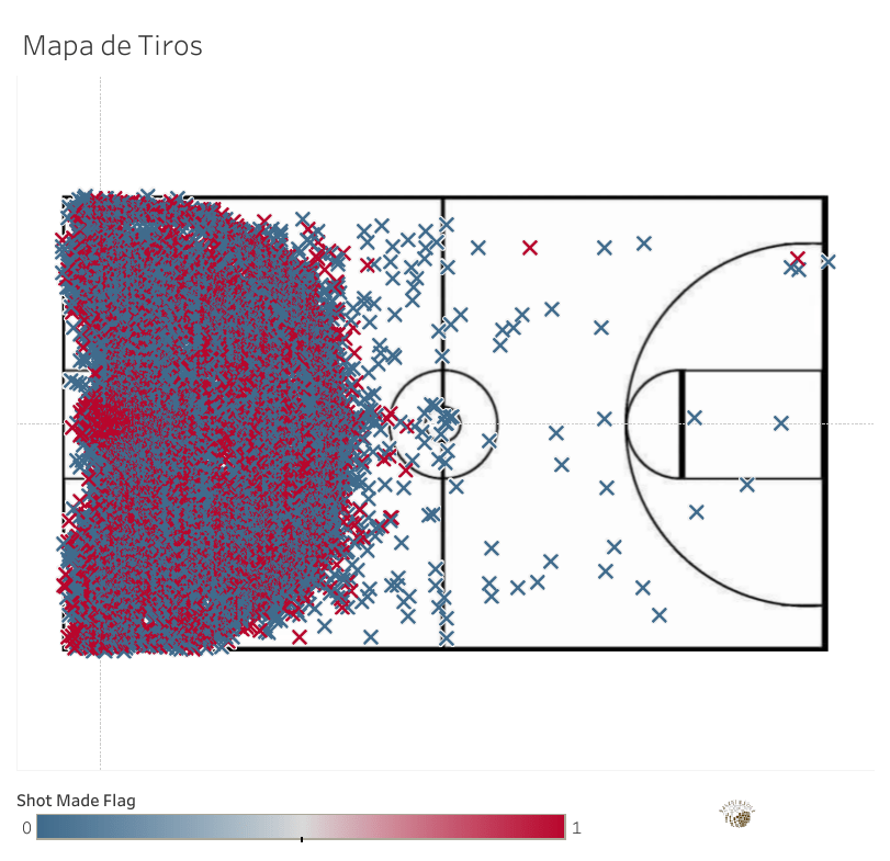 Para concluir el análisis, aquí se puede apreciar el mapa de los 27825 tiros de campo que LeBron James necesitó para romper el récord de anotación de la NBA. Con esta visualización solo quiero aportar una única cosa: para coronarse como el mejor, hay que fallar 13773 veces. No lo digo yo. Lo dicen los datos.
